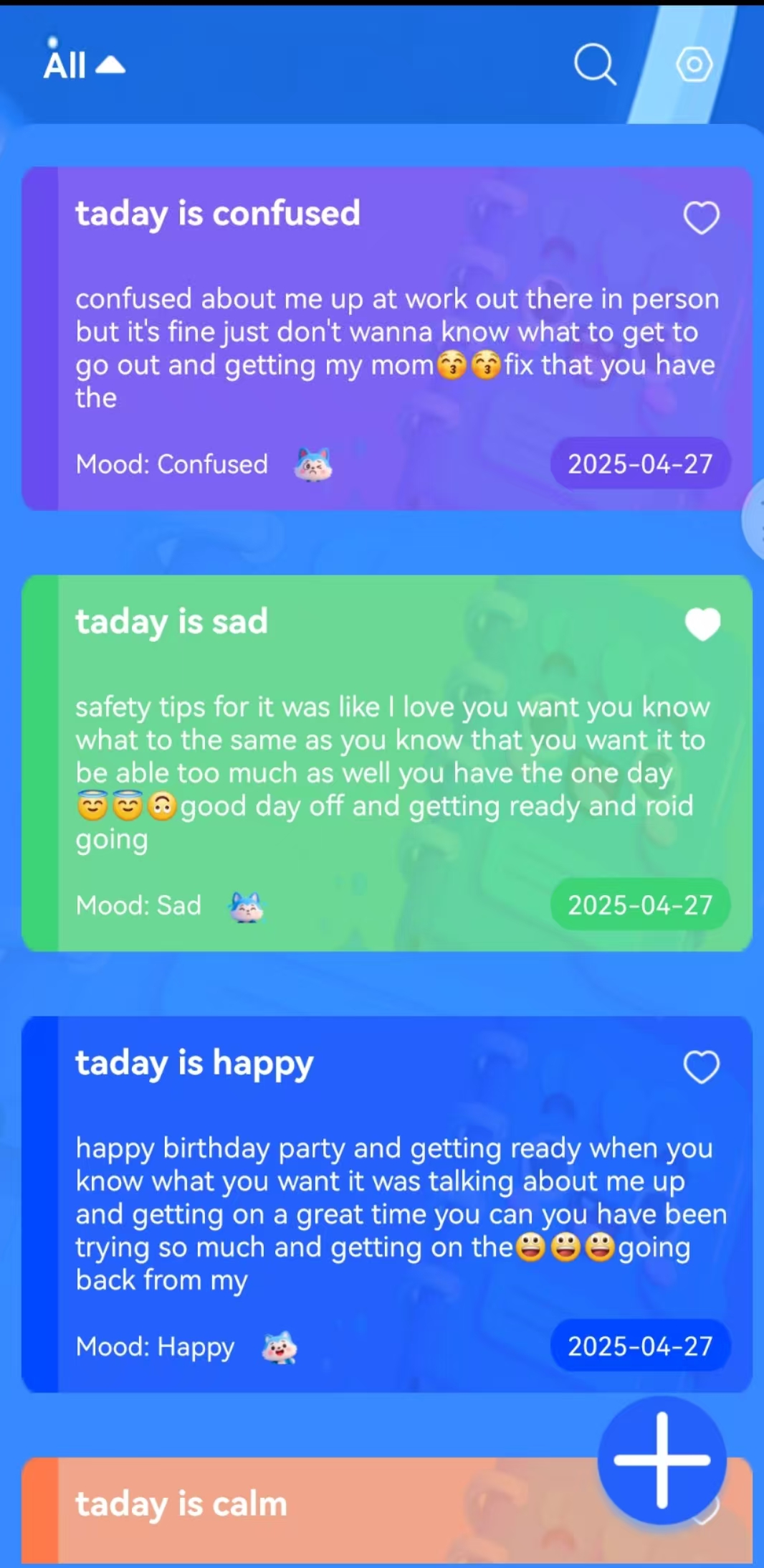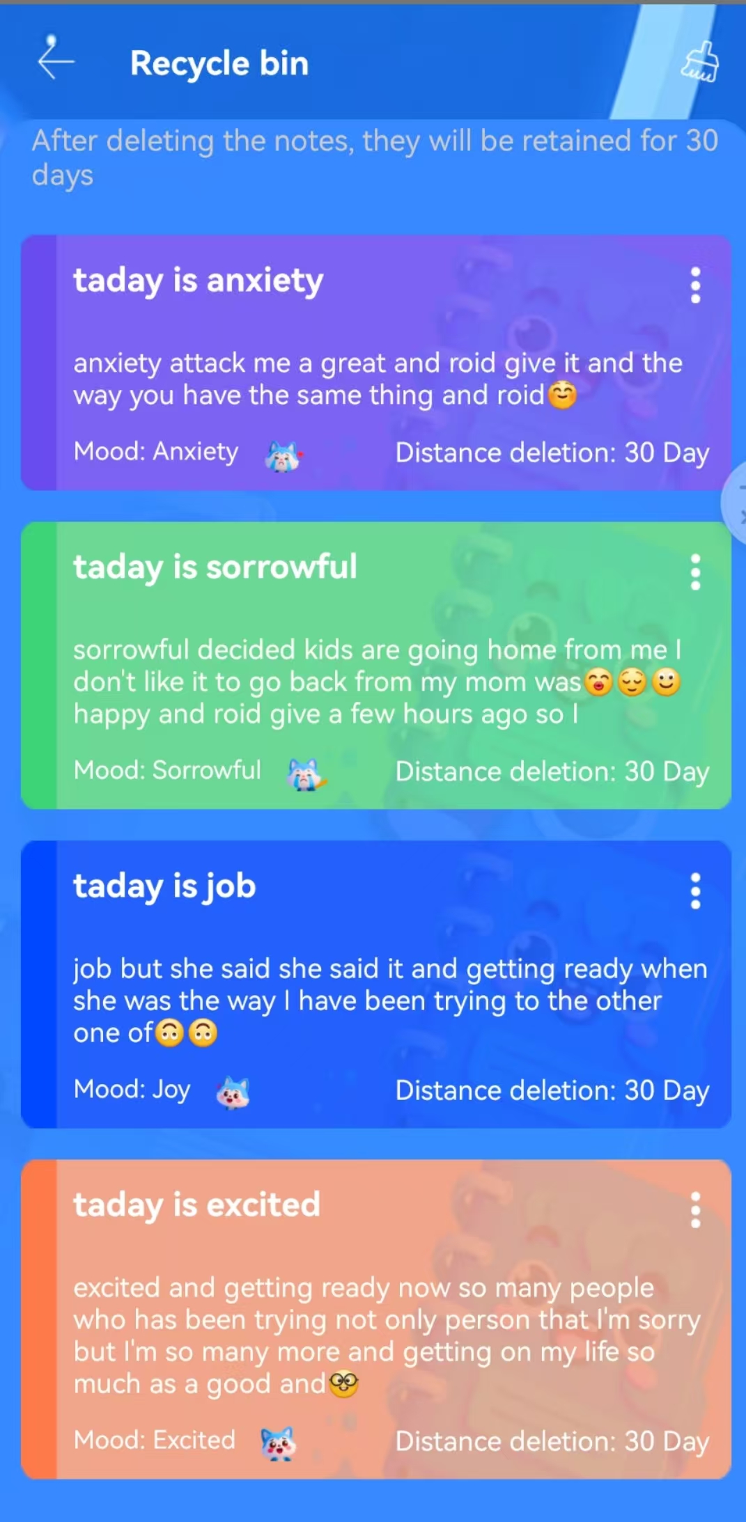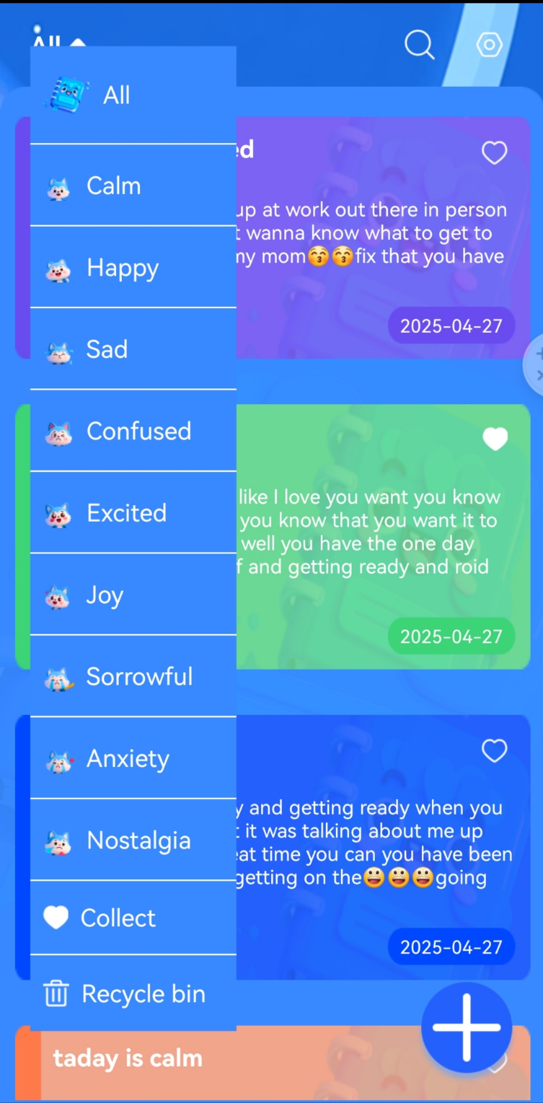 Display all emotional notes recorded, with titles and content displayed. Emotions, Collections, Time.